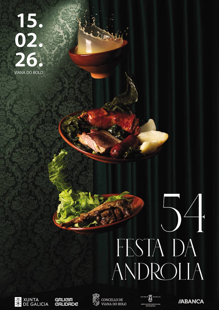 In the menu of the "Festa da Androlla", it is common to find other typical products of Galician cuisine for this season, such as "lacón con grelos" (pork shoulder with turnip greens) and "cachelos" (boiled potatoes). "Cocido" is the quintessential meal of Entrudio in the region, which combines pork-derived products such as "cachucha," "cacheira," chorizo, bacon, or the aforementioned "lacón".