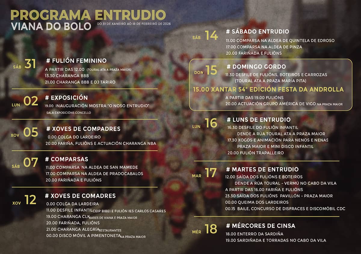 For more information about dates and events of the Entruido in Viana Do Bolo, you can contact the Town Hall of the locality.